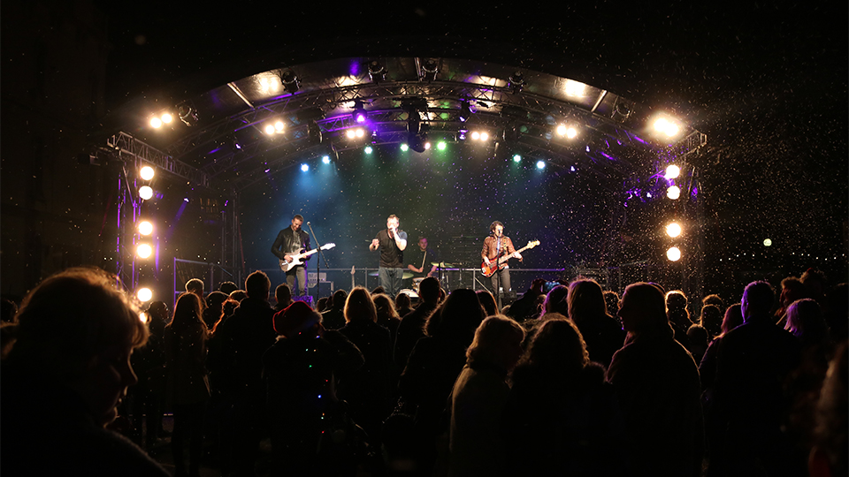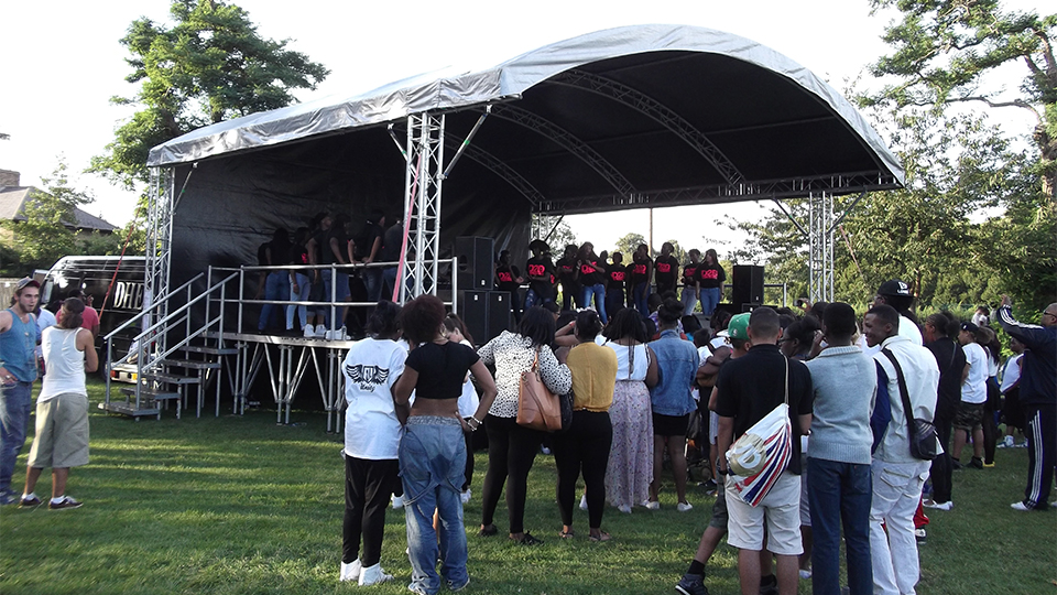 The stage area is 24ft x 20ft (7.3m x 6.0m. It is made from fifteen (15) 8ft x 4ft decks.