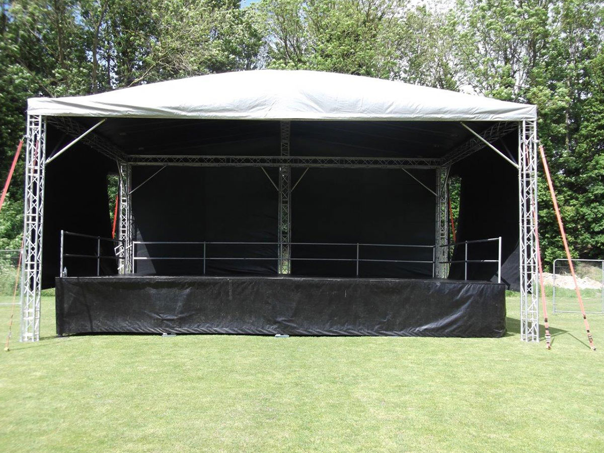 The stage area is 32ft x 20ft (9.8m x 6.0m). It is made from twenty (20) 8ft x 4ft decks.